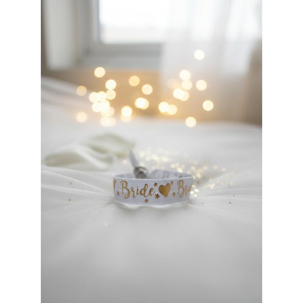 ⚪ 1x Biely náramok s nápisom "Bride" – určený špeciálne pre hviezdu večera (nevestu).