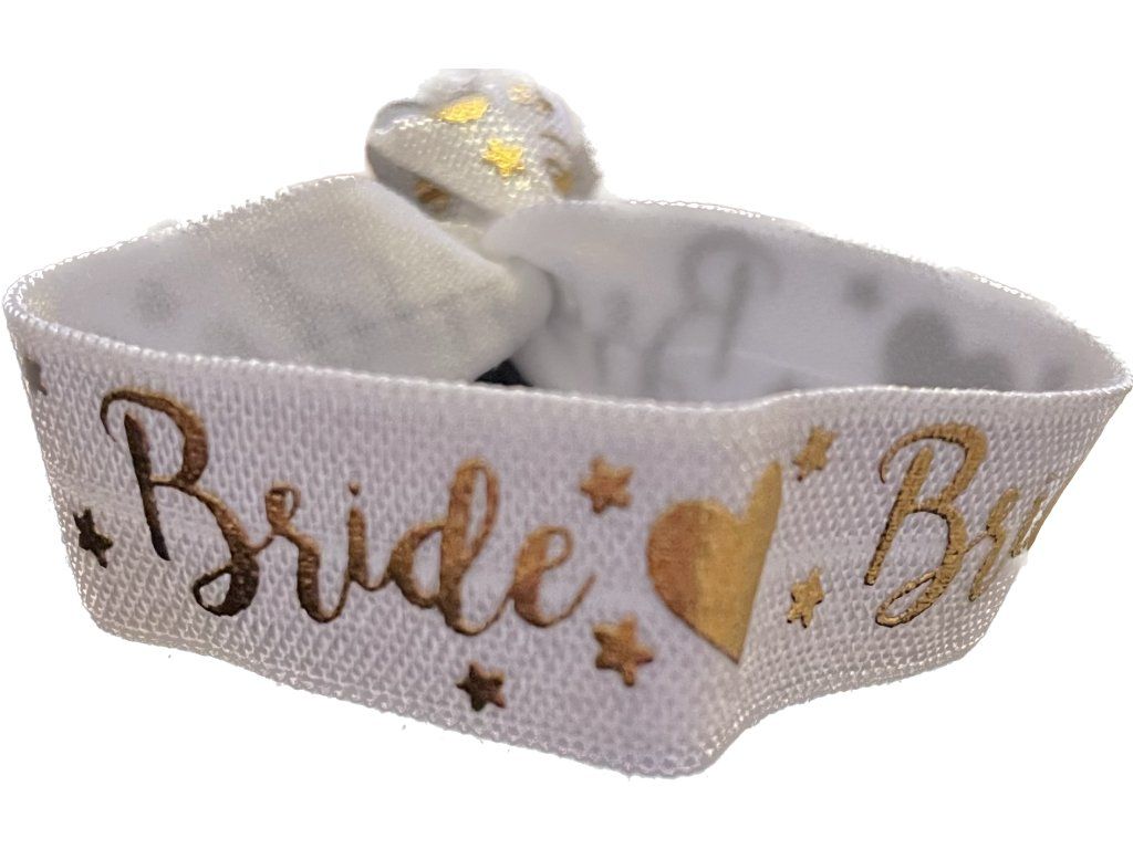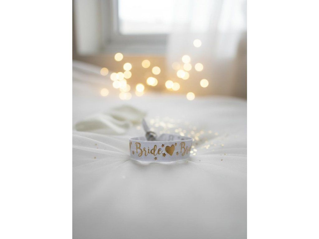 ⚪ 1x Biely náramok s nápisom "Bride" – určený pre hlavnú hviezdu večera (nevestu).