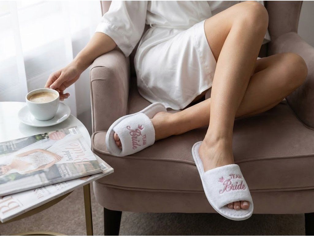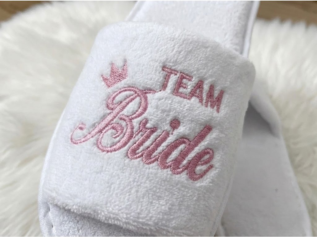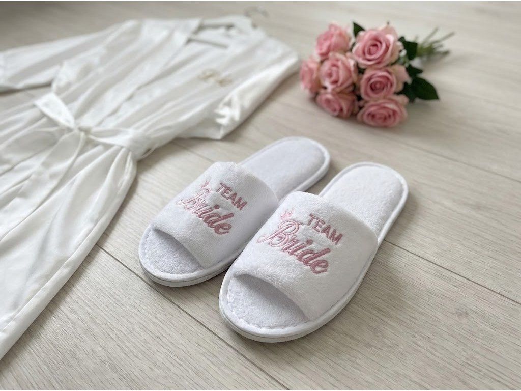 Povinná výbava na svadobné ráno! 🧖♀️ Doprajte svojim družičkám pohodlie a štýl s týmito mäkkými papučami. S ružovým nápisom Team Bride sú dokonalým doplnkom na spoločné fotenie v županoch alebo na wellness rozlúčku so slobodou.