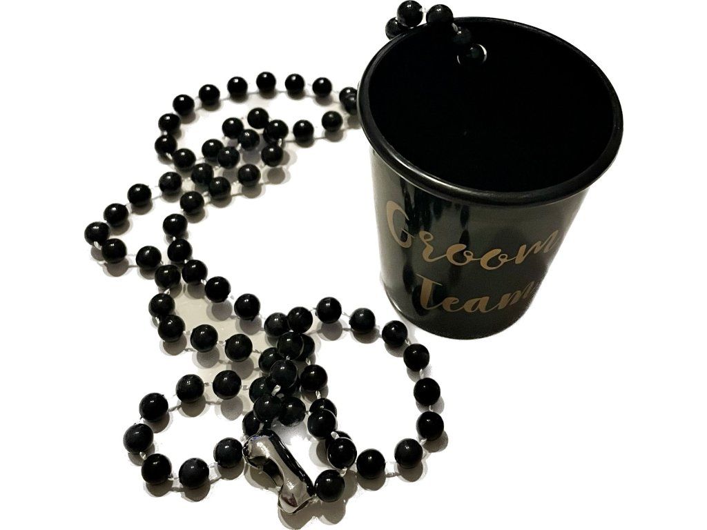 👑 Exkluzivita pre ženícha (Groom to Be): Ženích má špeciálny biely pohárik na krk, aby ako hlavná hviezda večera vynikol. Zvyšok partie má drsné čierne poháriky s nápisom Groom's Team.