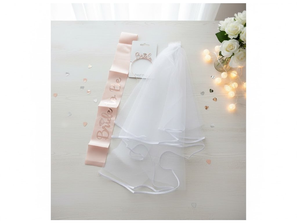 Chcete byť kráľovnou večera? 👸 Táto štýlová 3-dielna sada pre nevestu obsahuje všetko, čo potrebujete na nezabudnuteľnú rozlúčku so slobodou. Set obsahuje biely dvojvrstvový závoj, elegantnú šerpu s nápisom "Bride to Be" a kovovú čelenku, ktorá perfektne drží účes. Ideálny doplnok pre dokonalé fotky a zábavu v meste aj na chate! Skladom v Prešove. 🚀🥂