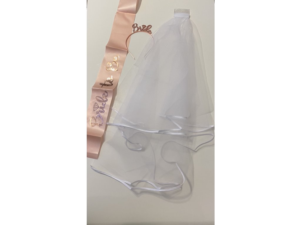 Sada na rozlúčku so slobodou pre nevestu: Závoj, šerpa Bride to Be a čelenka