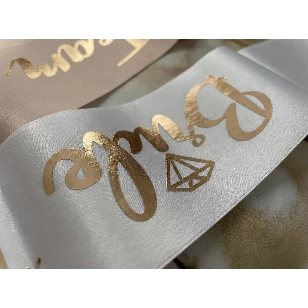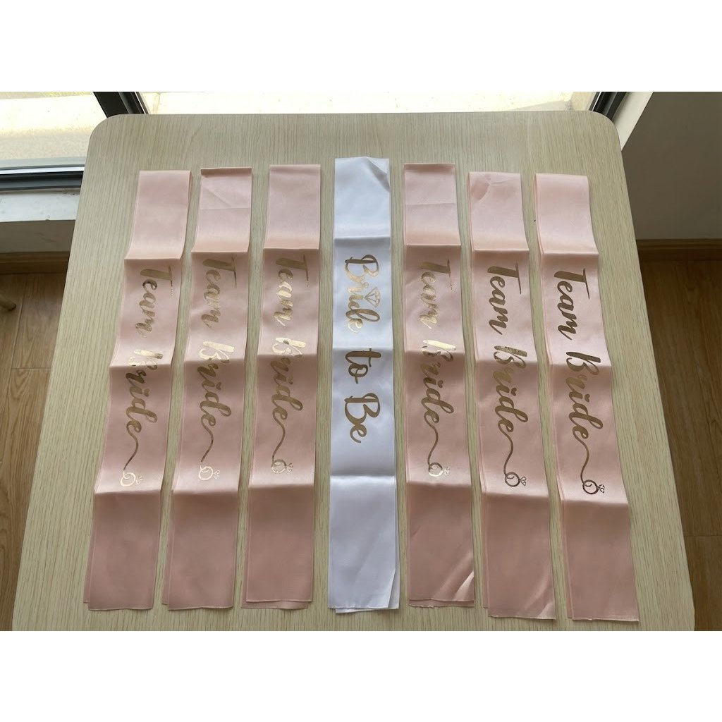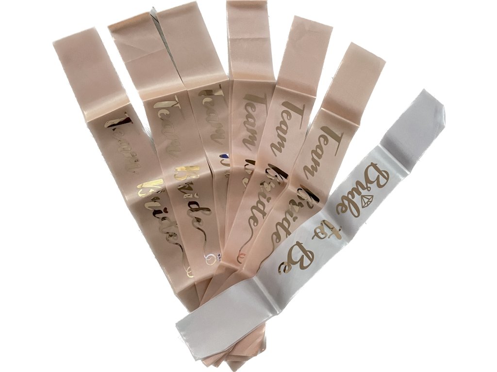 Kompletná výbava pre váš dievčenský tím! 👯♀️ Výhodný set obsahuje 1x bielu šerpu pre nevestu a 6x ružovú šerpu pre družičky. Elegantný satén so zlatým nápisom, ktorý na fotkách vyzerá luxusne. Univerzálna veľkosť.