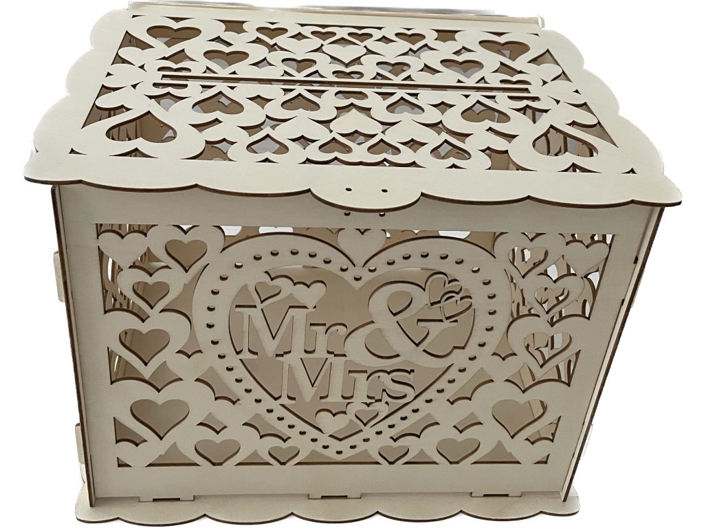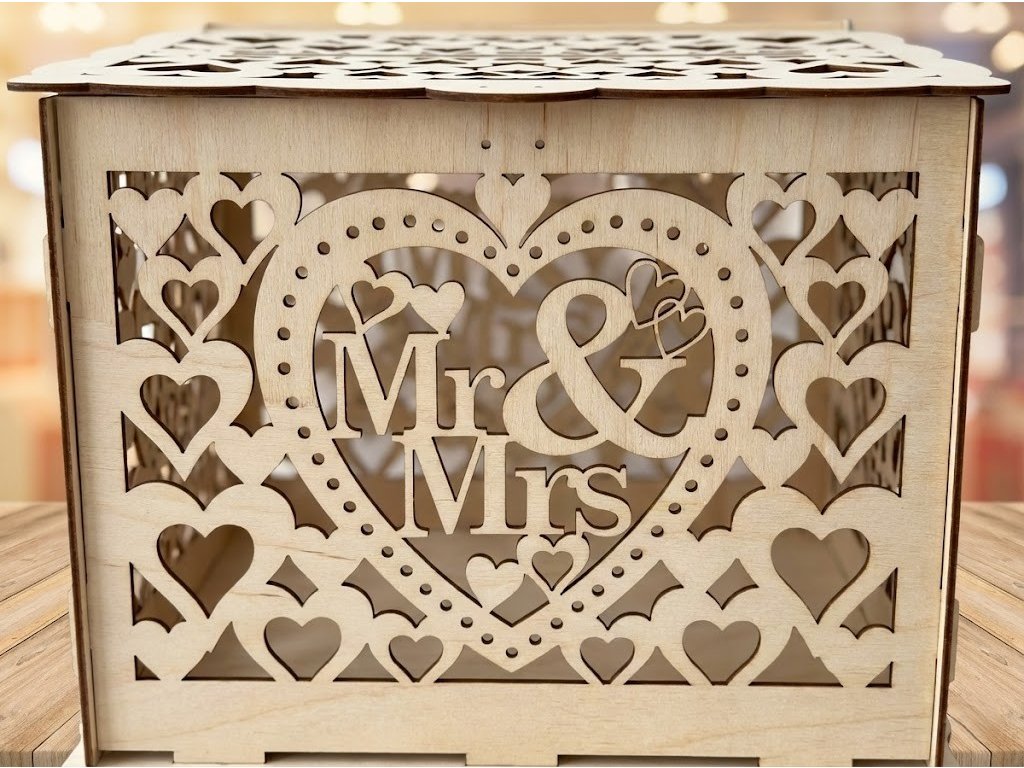 Kam s obálkami a želaniami od hostí? ✉️ Tento nádherný drevený box s motívom Mr & Mrs je štýlovým a bezpečným riešením. Precízne laserom vyrezávané srdiečka z neho robia krásnu dekoráciu svadobného stola.