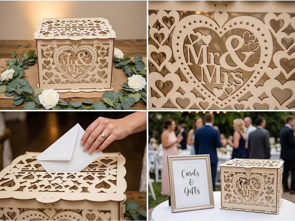 Tip na dekoráciu: Box umiestnite na stolík pri vstupe do sály, ideálne vedľa Knihy hostí. Môžete ho dozdobiť kvetmi alebo eukalyptom, hoci vďaka bohatému vyrezávaniu je krásny aj sám o sebe.