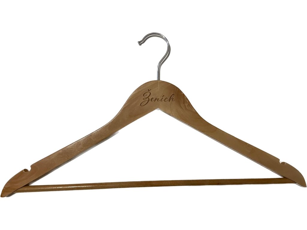Drevený vešiak s nápisom „Ženích“ je ideálny na zavesenie svadobného obleku počas príprav, fotenia aj ako štýlová dekorácia. Vynikne na svadobných fotografiách, dodá obleku noblesu a je skvelou pamiatkou na výnimočný deň. Vhodný ako originálny darček pre budúceho ženícha.